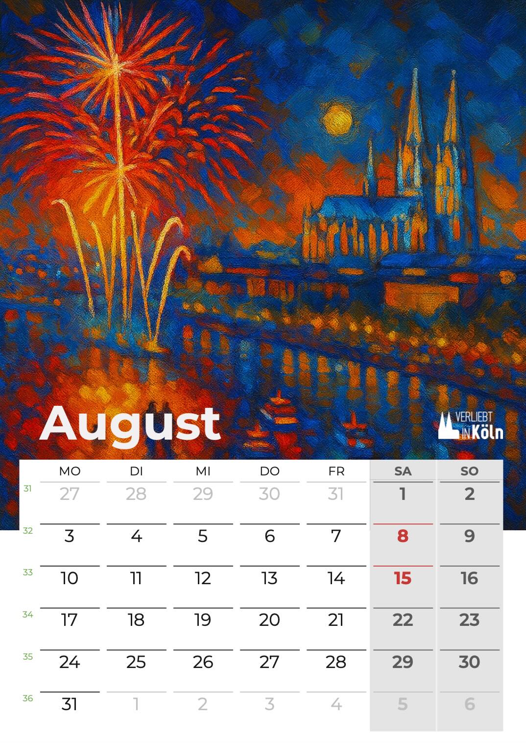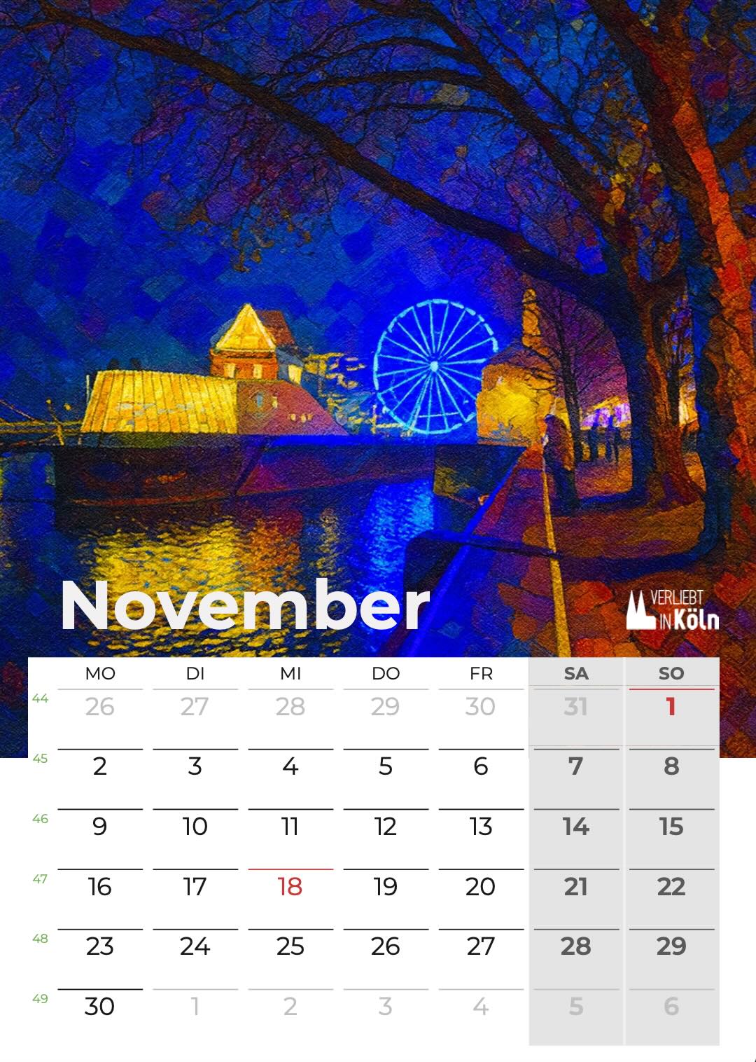 Ein Motiv ist natürlich der Dom, ihr findet im Kalender aber auch weitere Köln-Motive, die den Jahreszeiten entsprechen: Der Blick auf die Kirschblüten im Frühjahr, das Feuerwerk auf dem Rhein, den goldenen Herbst oder Köln zur Weihnachtszeit.
