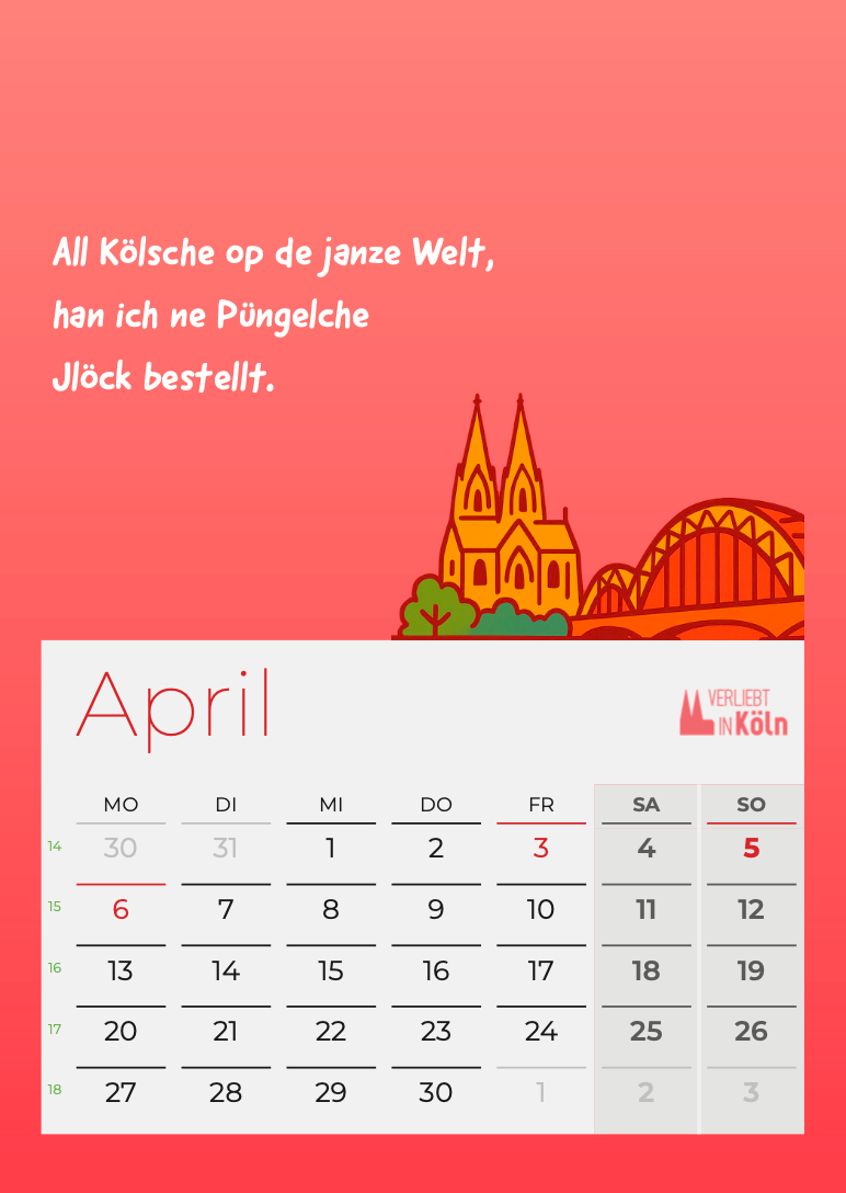 Der Kölner Sprüche Kalender für 2026 ist der perfekte Jahresbegleiter: 12 kölsche Sprüche zaubern einem garantiert das ganze Jahr über ein Lächeln ins Gesicht.