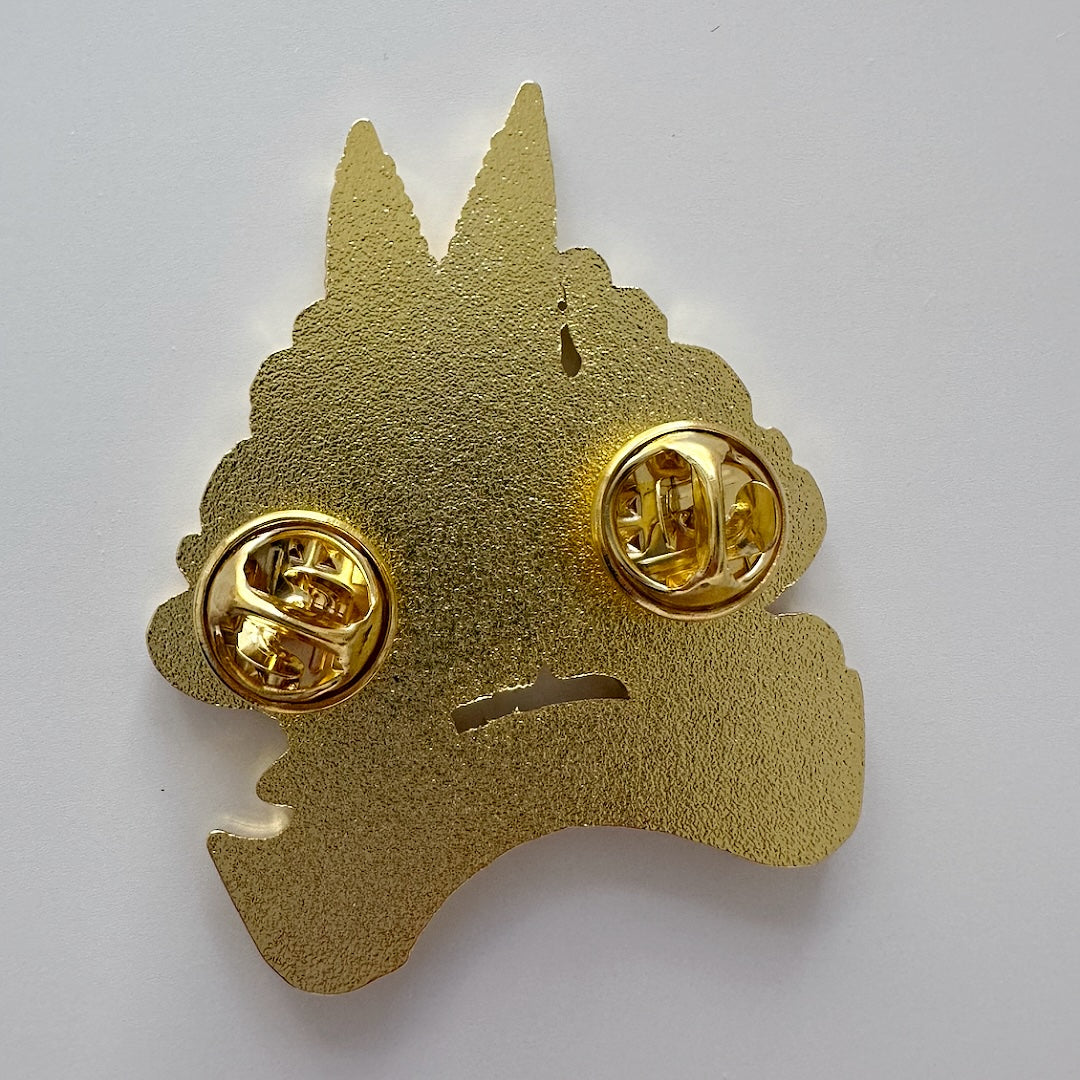 Der Pin hat auf der Rückseite zwei Ösen. Das sorgt für einen stabilen Halt und verhindert, dass er am Kostüm, dem Anzug oder der Kleidung abfällt - etwa in der Kneipe oder im Gedränge.